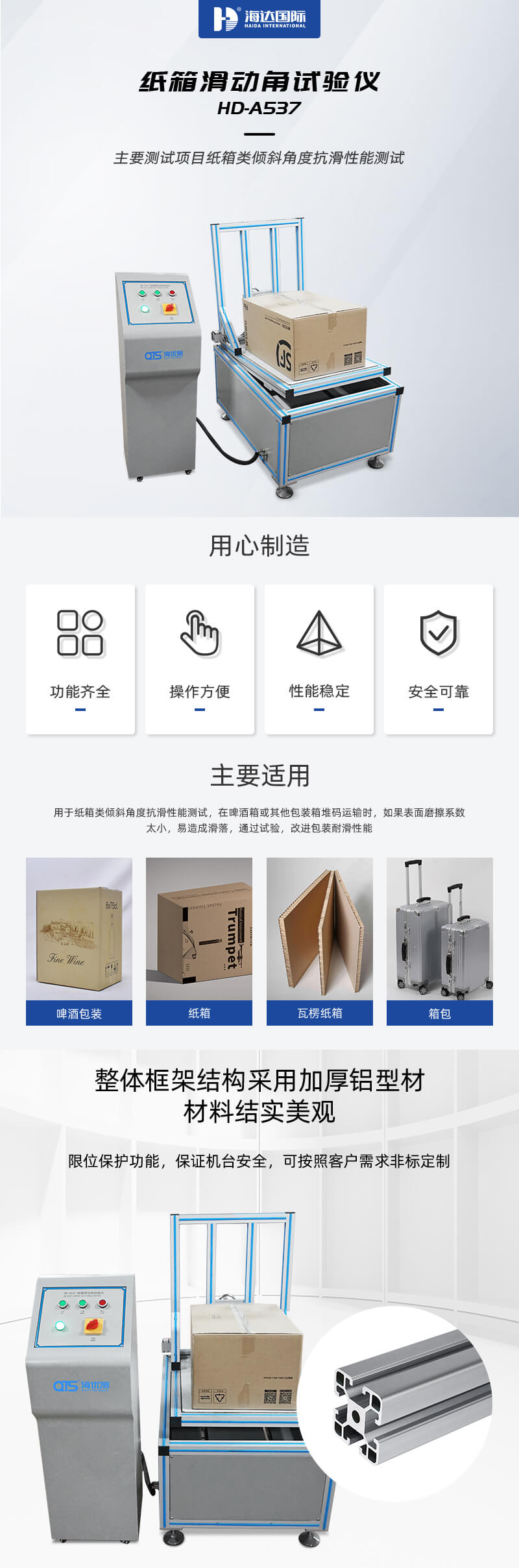 紙箱滑動角試驗儀將紙箱滑動角測試儀用于紙箱類傾斜角度抗滑性能測試,在啤酒箱或其他包裝箱堆碼運(yùn)輸時,如果表面磨擦系數(shù)太小,易造成滑落,通過試驗,改進(jìn)包裝耐滑性能。