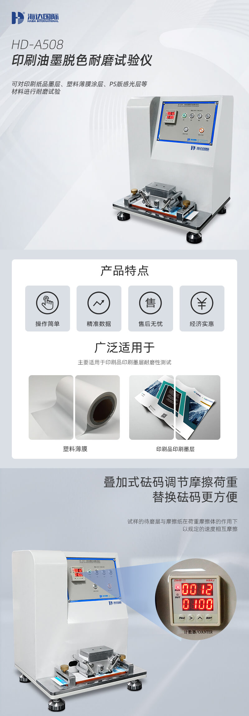 印刷油墨脫色耐磨試驗(yàn)儀主要適用于印刷品印刷墨層耐磨性測(cè)試。將標(biāo)準(zhǔn)尺寸的摩擦紙包于摩擦頭,以規(guī)定的速度、壓力等對(duì)試樣表面進(jìn)行摩擦,觀察試樣墨層脫落情況。