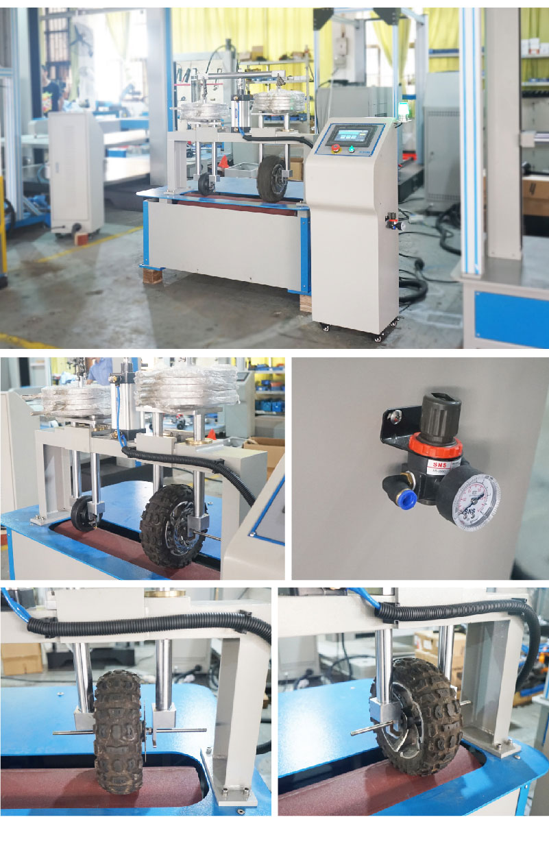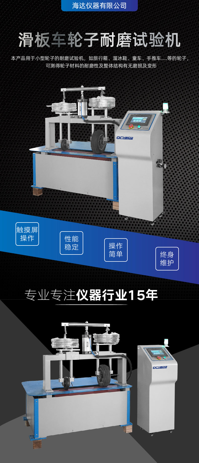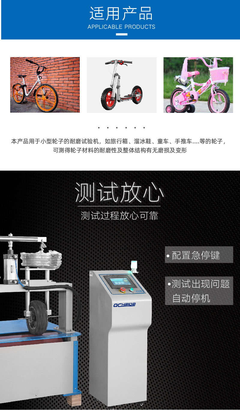 滑板車輪子耐磨測試機適用于小型輪子的耐磨試驗,如旅行箱、滑冰鞋、童車、手推車的輪子。可測得輪子材料的耐磨性及整體結構有無磨損及變形,試驗的結果可供作改進的參考。