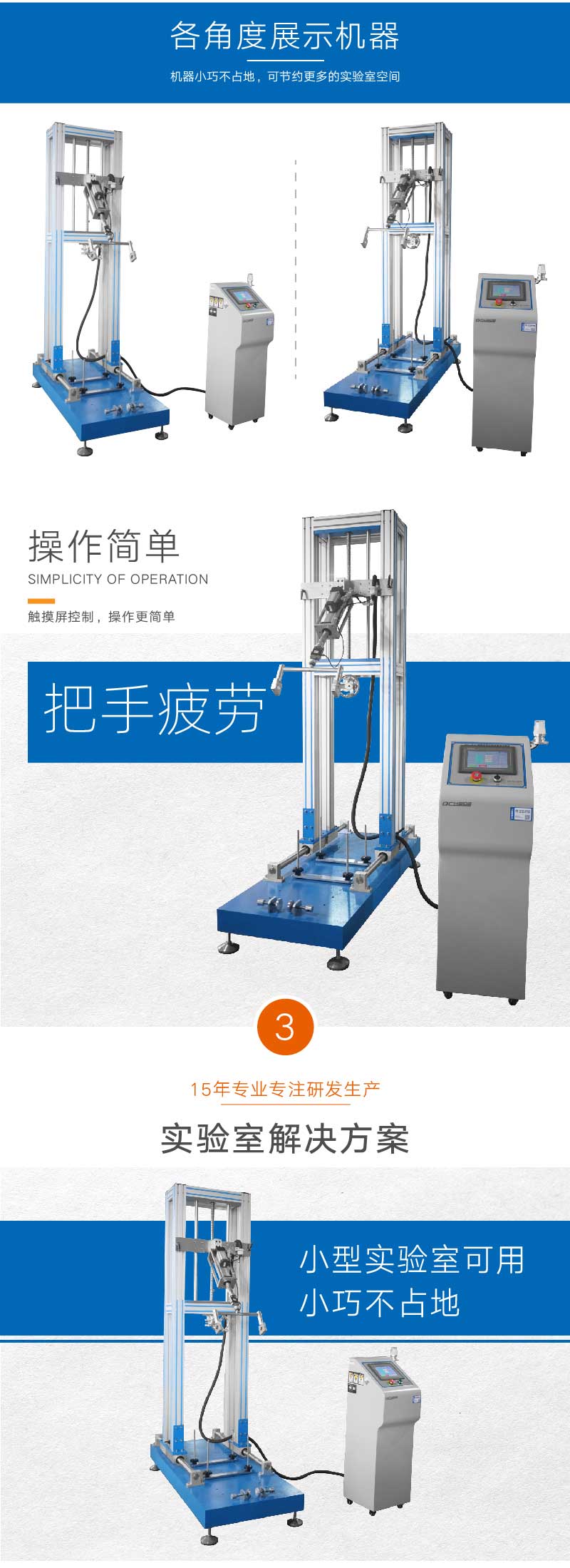 滑板車龍頭手把桿疲勞試驗(yàn)機(jī)適用于前輪搖擺時(shí)對(duì)把手進(jìn)行測(cè)試,如滑板車、童車、手推車的把手。滑板車在使用時(shí),人對(duì)車把手會(huì)產(chǎn)生一個(gè)按壓或拉伸的力,本儀器便是模擬這種循環(huán)拉壓過程,來觀察記錄滑板車把手機(jī)械性能及整體結(jié)構(gòu)的疲勞情況。