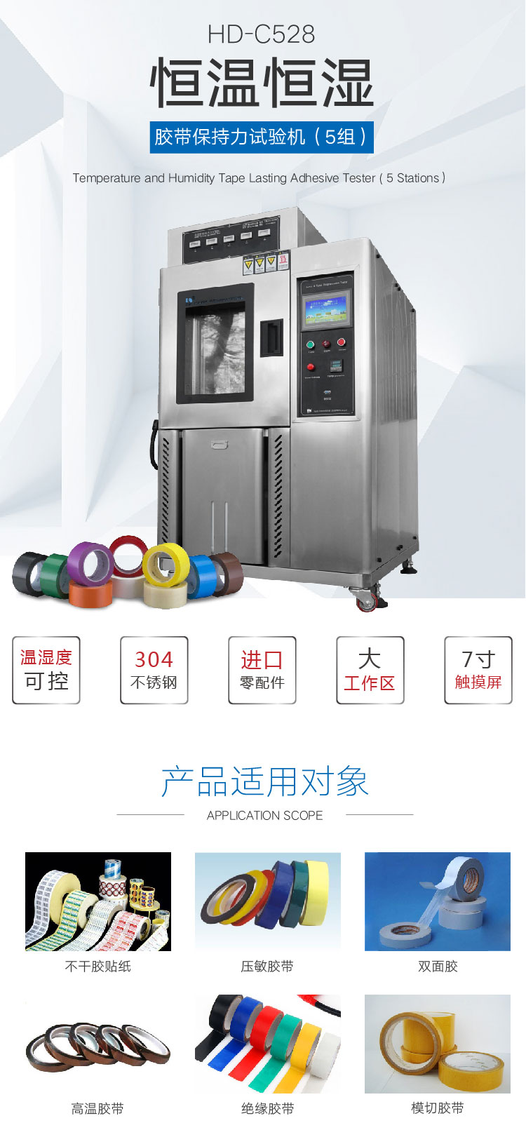 恒溫恒濕膠帶保持力試驗機主要用于測試試樣的抗粘連性,測試壓敏膠帶持粘性,靜態負荷試驗。將膠帶粘于試驗板上, 下端懸掛標準荷重,經一段時間自動計時后, 測量膠帶下滑距離或膠帶粘著時間用來評定膠帶粘著的持久性。