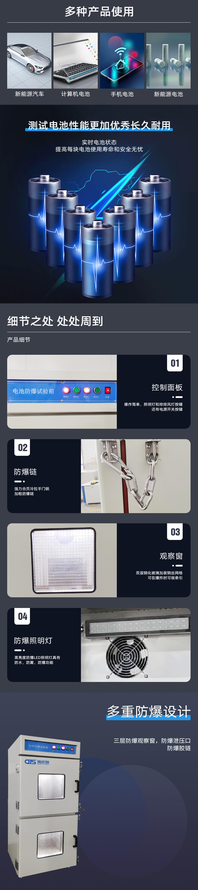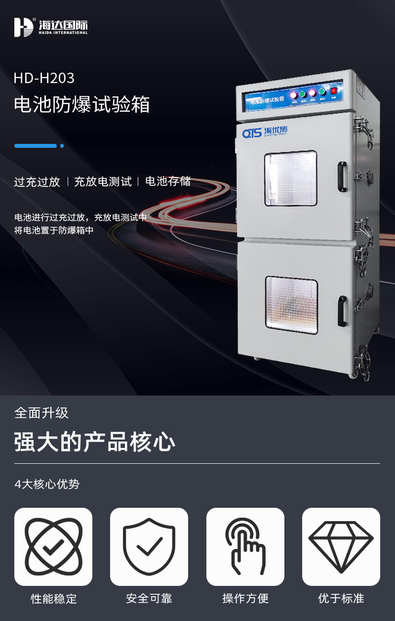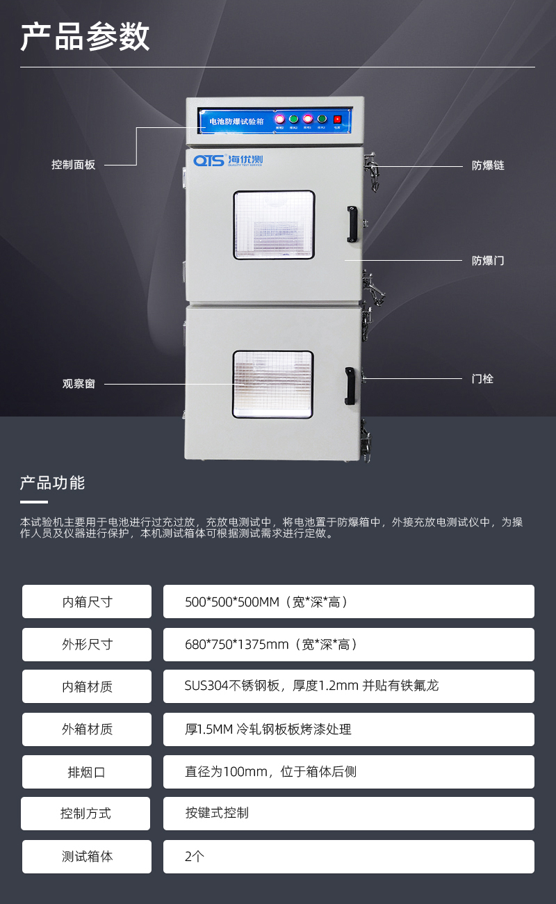 電池防爆試驗(yàn)箱主要用于電池進(jìn)行過充過放,充放電測試中,將電池置于防爆箱中,外接充放電測試儀中,為操作人員及儀器進(jìn)行保護(hù),本機(jī)測試箱體可根據(jù)測試需求進(jìn)行定做。
