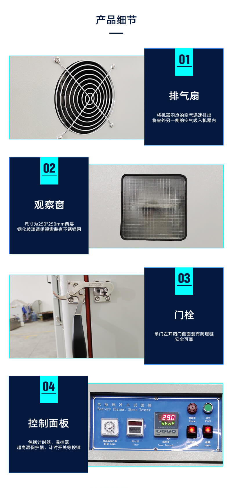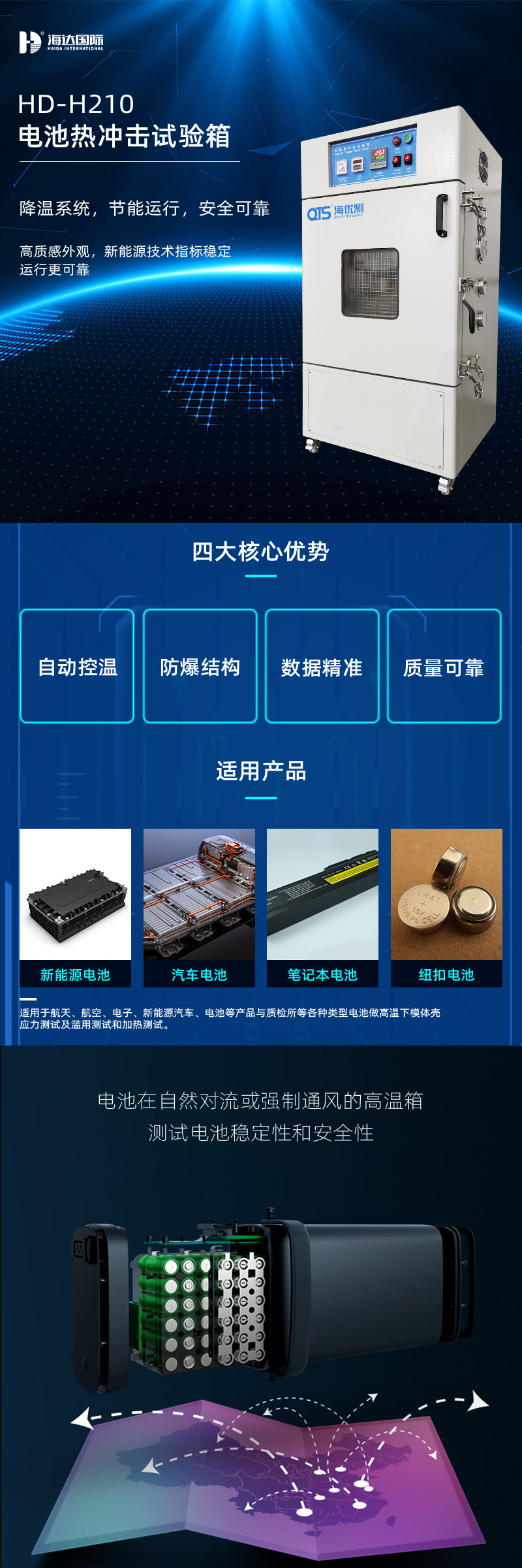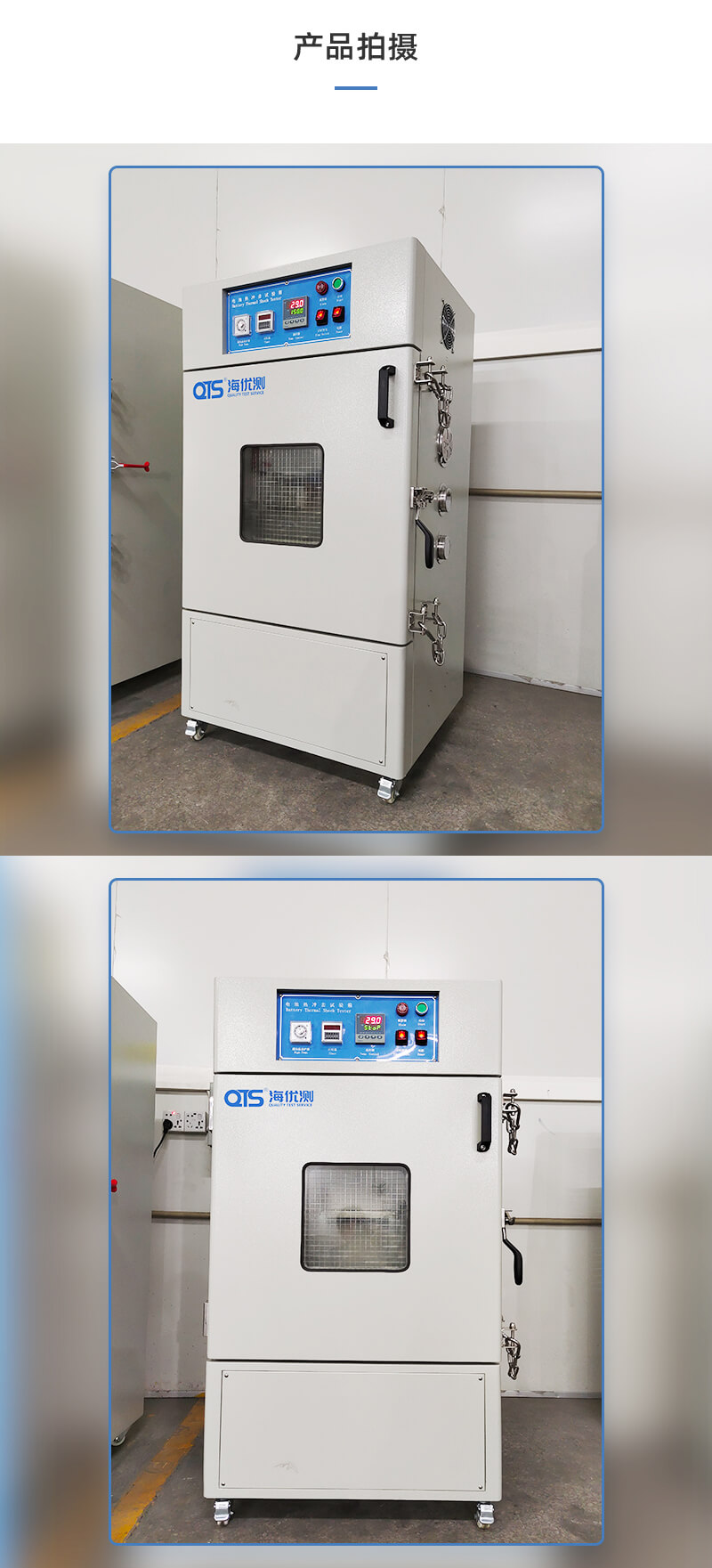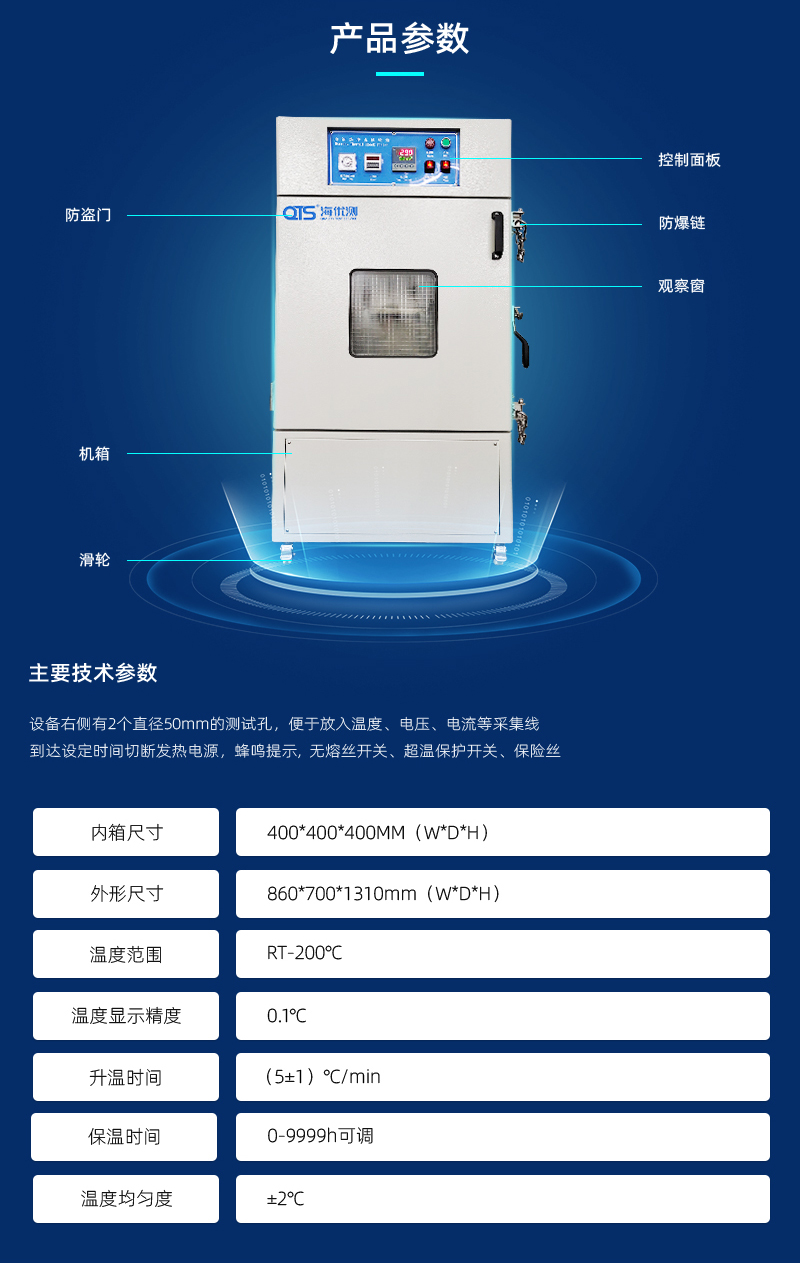 電池?zé)釠_擊試驗(yàn)箱是模擬電池放置在自然對(duì)流或強(qiáng)制通風(fēng)的高溫箱中,以一定的升溫速率升溫至設(shè)定測(cè)試溫度并保持一定時(shí)間,采用熱風(fēng)循環(huán)系統(tǒng),可保證工作溫度分布均勻。